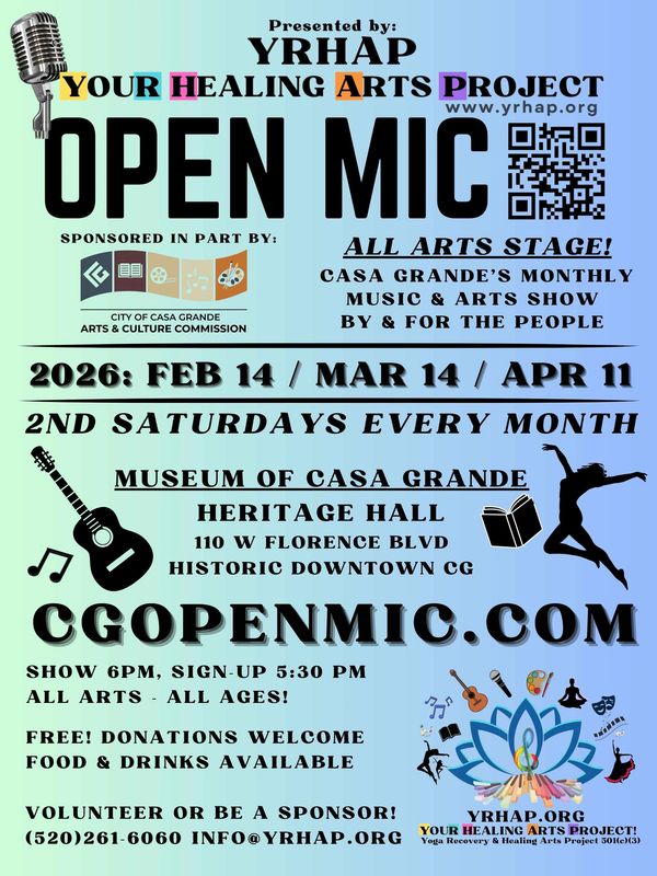 A big thank you to the City of Casa Grande's Arts & Culture Commission for supporting Open Mic All Arts Stage! We appreciate the City's support in helping YRHAP provide a quality all-ages event every 2nd Saturday of the month!