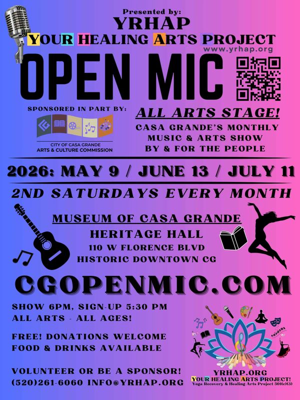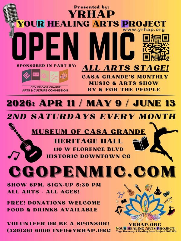 A big thank you to the City of Casa Grande's Arts & Culture Commission for supporting Open Mic All Arts Stage! We appreciate the City's support in helping YRHAP provide a quality all-ages event every 2nd Saturday of the month!
